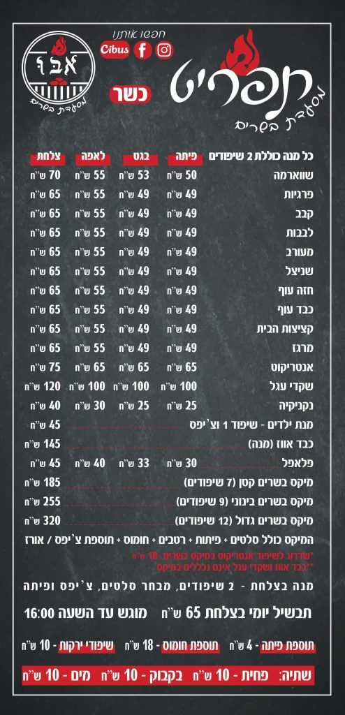 מנה בצלחת – 2 שיפודים, מבחר סלטים ופיתה. תוספת פיתה 4 שח | תוספת חומוס 12 שח | תוספת שיפוד ירקות 10 שח.